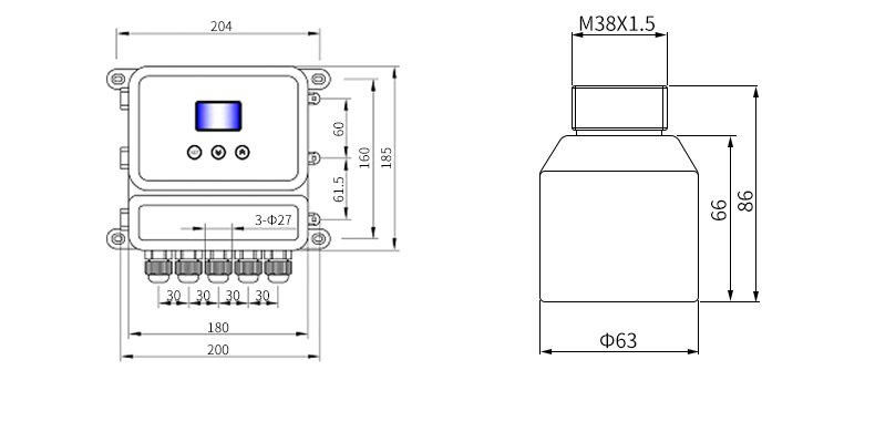 MIK-DFG分體式超聲液位/物位計是測量一個超聲波脈沖從發(fā)出到返回整個過程所需的時間。超聲波液位計垂直安裝在液體的表面,它向液面發(fā)出一個超聲波脈沖,經(jīng)過一段時間,超聲波液位計的傳感器接收到從液面反射回的信號,信號經(jīng)過變送器電路的選擇和處理,根據(jù)超聲波液位計發(fā)出和接收超聲波的時間差,計算出液面到傳感器的距離。分體式超聲波液位計廣泛用于罐體、水池、水庫的液位和體積測量,也可用于明渠的流量測量。