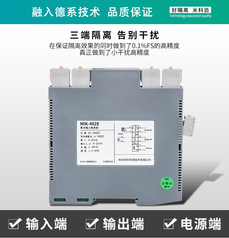 MIK-402E系列信號隔離器,電壓、電流隔離器將直流電壓或電流信號經過隔離傳送,轉換成所需的信號給其他儀表。可以與單元組合儀表及DCS、PLC等系統配套使用,給予現場儀表信號隔離、信號轉換、信號分配、信號處理等,從而提高工業生產過程自動控制系統的抗干擾性能力,保證系統的穩定性與可靠性。本產品品種分為一進一出、一進二出、一進三出、一進四出、二進二出,且輸入、輸出、電源三端隔離。并且大量運用于配電柜和隔離箱等各種工業場合。