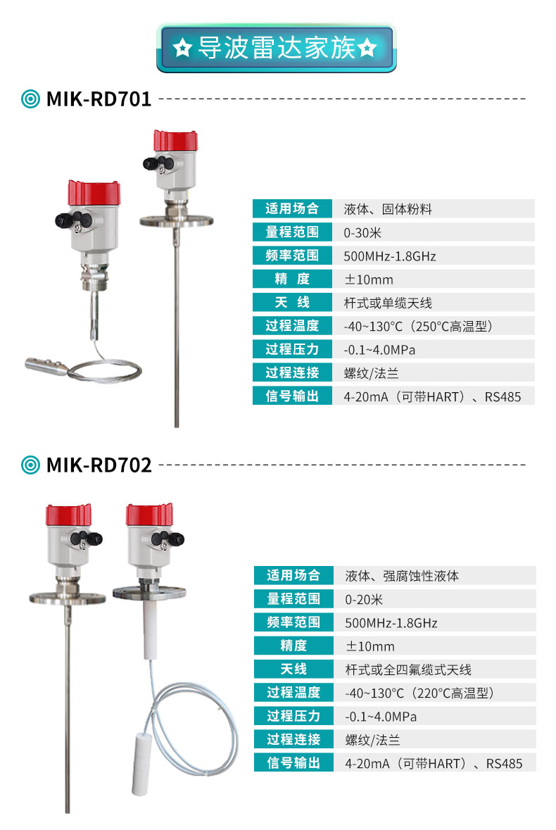 適用場合:米科MIK-RD901/902高頻雷達液位計,新型快速的微處理器可以進行更高速率的信號分析處理,使得儀表可以用于水液儲罐、酸堿儲罐、漿料儲罐、固體顆粒、小型儲油罐,以及各類導電、非導電介質、腐蝕性介質,還有如煤倉、灰倉、油罐、酸罐等一些復雜的測量工況。