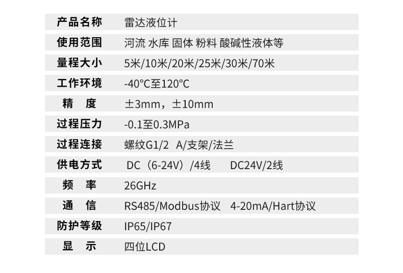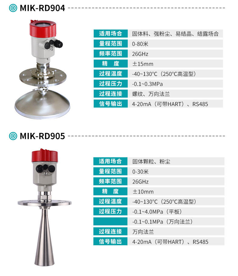 米科MIK-RD903/904/905高頻雷達料位計,26G高頻系列可用于需要發(fā)射角度小精度高的場合。