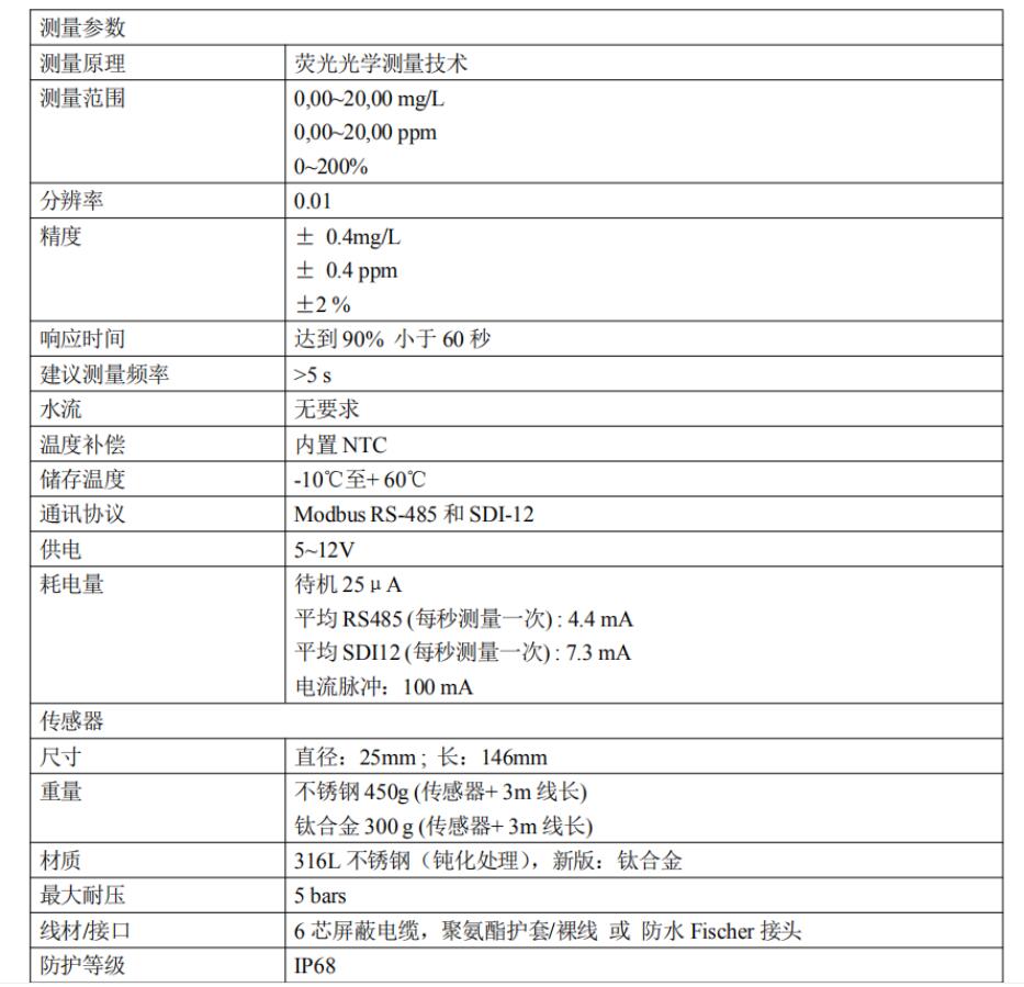適用場合:傳感器是基于熒光猝熄原理,綠光照射到熒光物質時使熒光物質激發并發出紅光,由于氧分子可帶走能量,所以激發的紅光的時間與氧分子的濃度成反比,通過測量紅光的持續時間就可以計算溶解氧的濃度。 傳感器已通過美國材料與試驗協會國際試驗方法D888-05的認證。 廣泛應用于城市污水、工業廢水、海水、漁業、水產養殖、地表水、飲用水等場合的溶氧量測量。