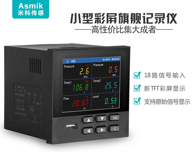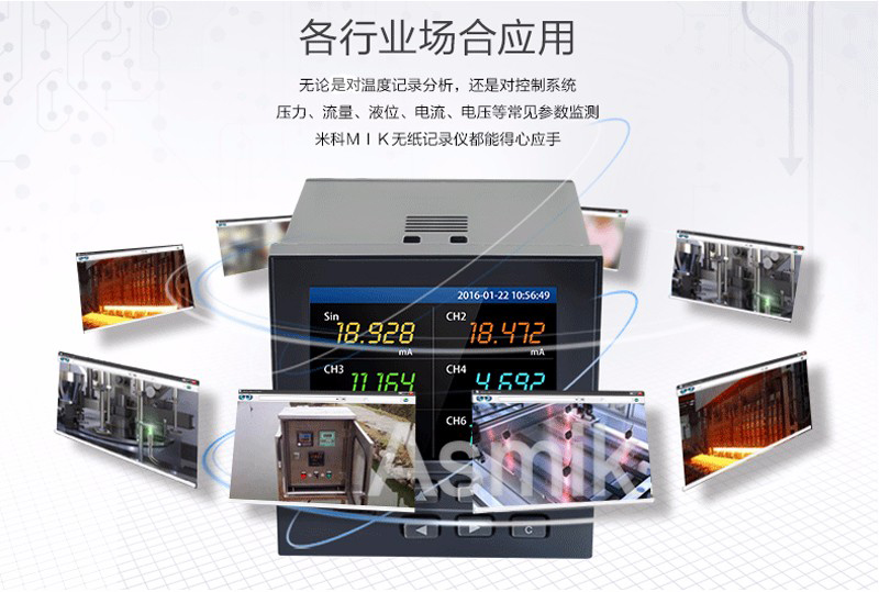適用場合:米科MIK-R200T 無紙記錄儀1~6通道,集數據的測量、顯示、處理、運算、報警、記錄報表等多種功能于一身。可采集直流電壓、電流、熱電偶、熱電阻等常規數值的的采集與記錄。